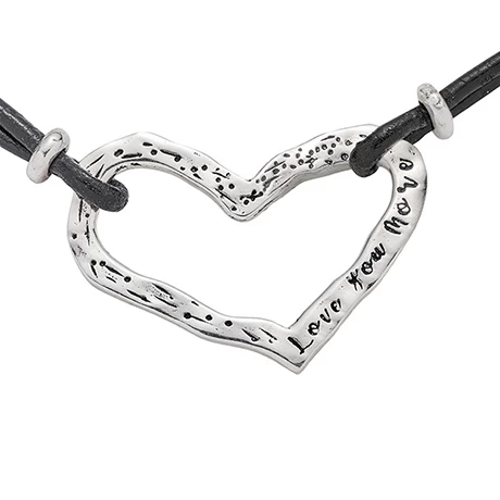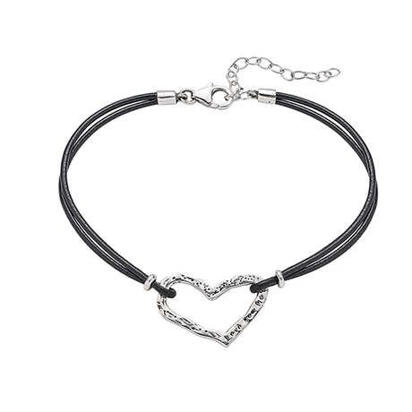 Let your sweetheart know how much you love them with this charming sterling silver bracelet on twin black leather cords. There’s a hidden “Love you more” message lightly engraved on the textured cutout hearts. The chain adjusts the bracelet to fits wrists 7″-9″.