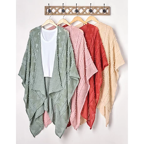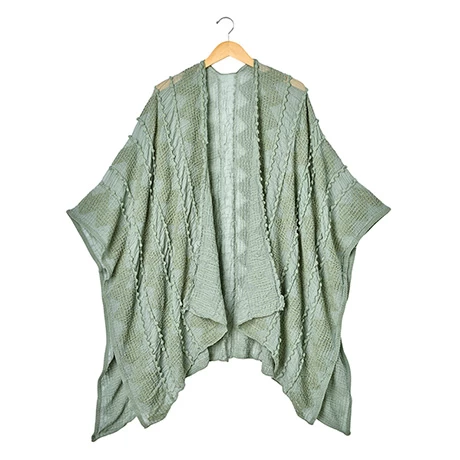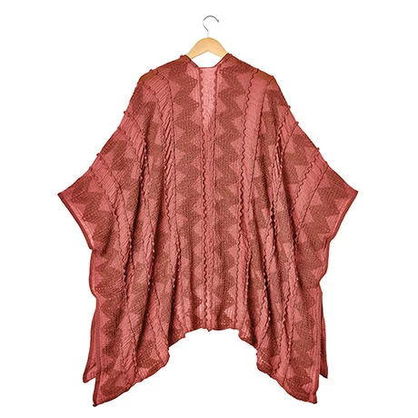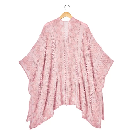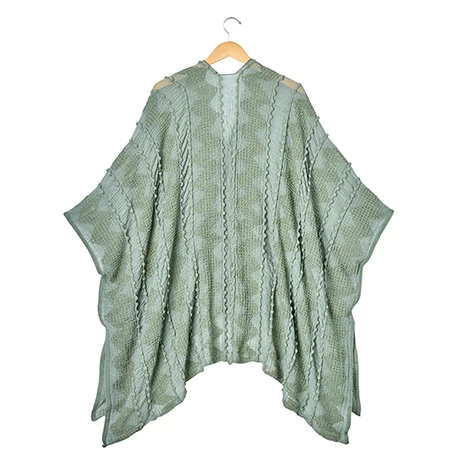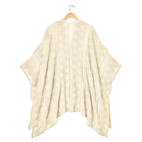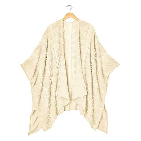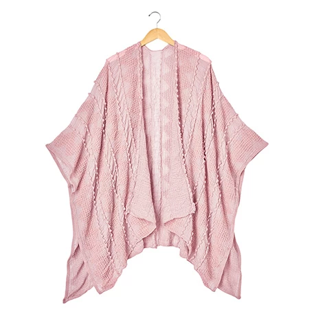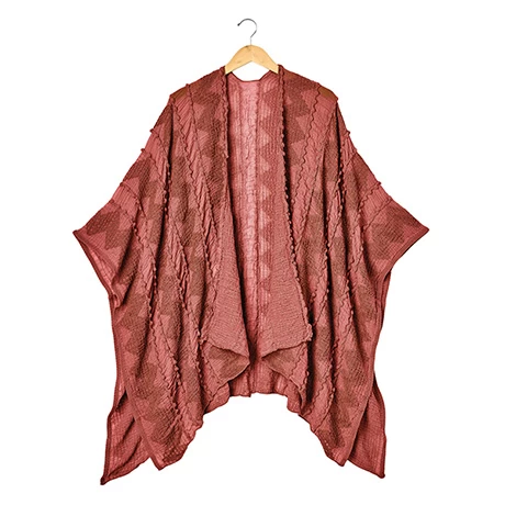 You’ll have to feel this shawl to believe how soft it is. Bubble gauze, chenille yarn and rows of bobbles create an eye-catching ruana. Stitched on sides to create arm holes. Polyester. Hand wash. Imported. One size. Specify Seafoam, Ivory, Pink or Rust.