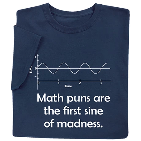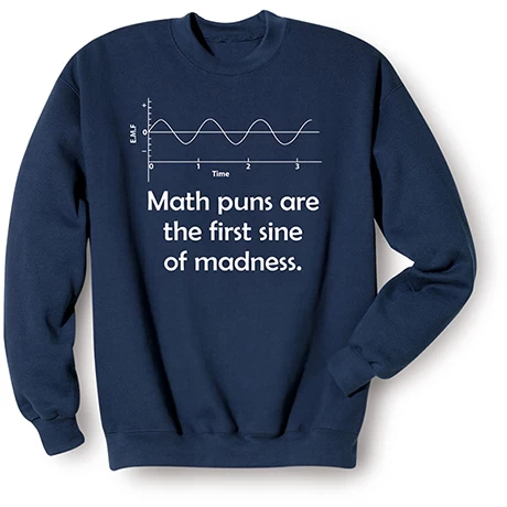 Proving that the only thing that can make mathematical functions more fun is a great pun! Navy sweatshirt is 50/50 cotton/poly. T-shirt is preshrunk 100% cotton. Machine wash. Imported. S-3X.