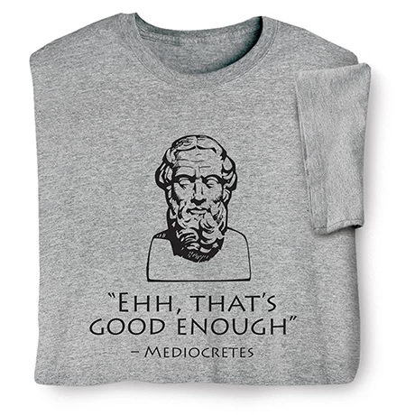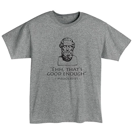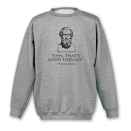 Socrates believed that knowledge is the only good. Plato believed in the ideal state. One of the lesser-known Greek philosophers, Mediocretes aimed lower. Sport gray sweatshirt is 50/50 cotton-poly, T-shirt is preshrunk 90/10 cotton-poly. Sizes M-2XL. Imported.