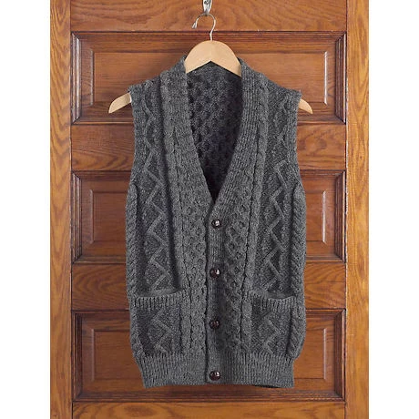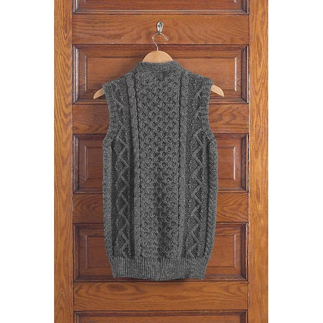 He’ll wear it proudly for years and years. Made in Westport, County Mayo, Ireland, pure wool “weskit” features traditional stitches and cables symbolizing fishermen’s ropes. V-neck, roomy pockets, football buttons, ribbed waist and trim. Size L hangs 26 1/2″. Order one size up for a more generous fit. Dry-clean or hand wash. Color: Charcoal. Men’s sizes M, L, XL, XXL.