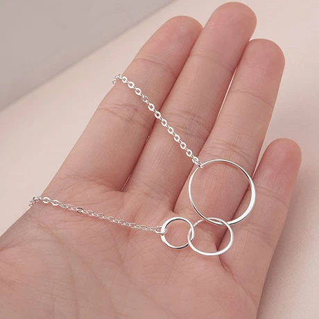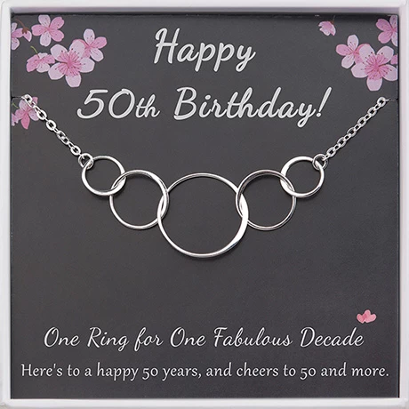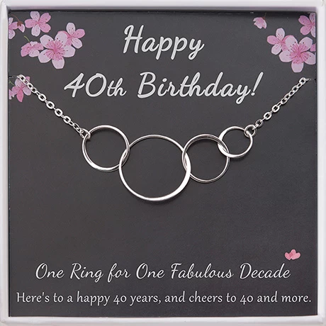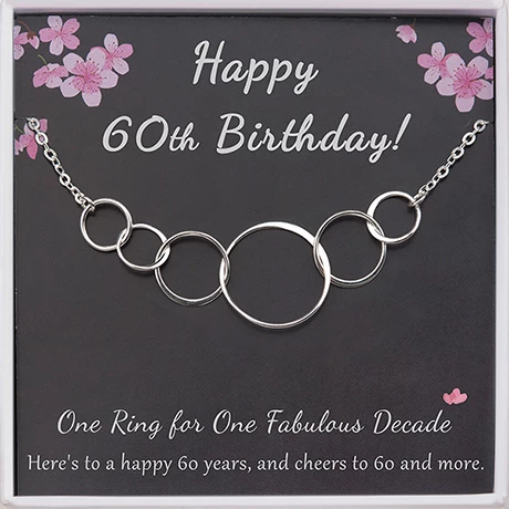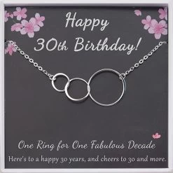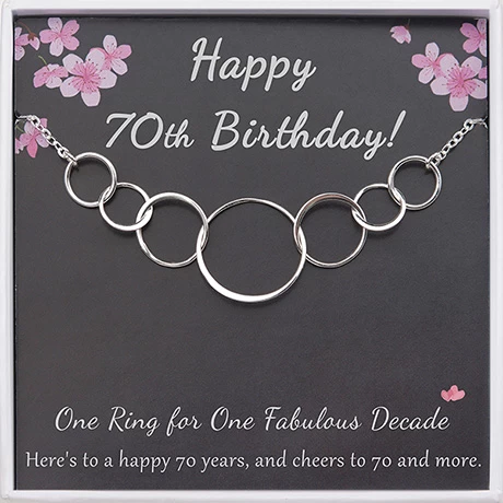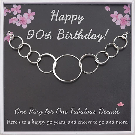 A delicate necklace with sterling silver interlocking rings (one for each decade) celebrates the milestone birthday and the interconnectedness of life’s experiences. The circles hang from a whisper-light sterling silver chain. A thoughtful gift for a grandmother, mother, sister, coworker or best friend. Giftboxed with storycard. Chain length: 16″ – 18″. Specify 30, 40, 50, 60, 70, 80, or 90 yeas. Allow 2-3 weeks. No rush delivery.