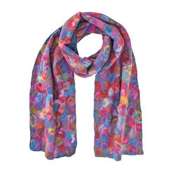 Nuno felting – a wet felting technique , is the process of applying wool yarn to felted fabric. The result? A gorgeous scarf reminiscent of millefiori, the Venetian art of fusing glass rods into “a thousand flowers”. Wool/poly chiffon. Handmade in Nepal, Fair Trade. 75″ x 12″.