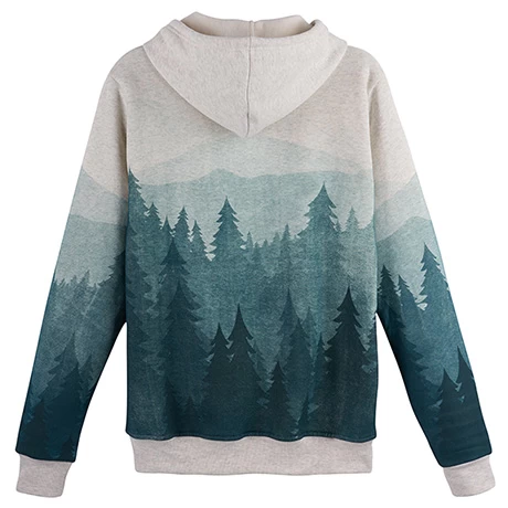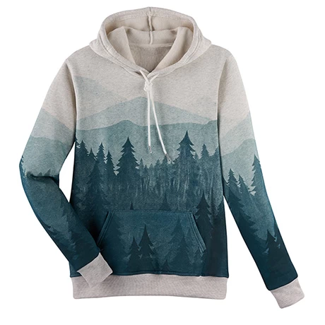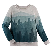 With their all-over print of tall trees and distant mountains, they’re almost too pretty to be sweats. Super-soft and fleecy hooded sweatshirt has a ribbed neck, cuffs, and hem, raglan sleeves, and welting at the neck and hem. Hoodie has a drawstring hood, kangaroo pocket, ribbed cuffs and hem. Palest gray cotton-poly blend. Each hangs 26″. Women’s sizes S(4-6), M(8-10), L(10-12), XL(14-16), 1X(16-18), 2X(18-20), 3X(22-24). For a roomy fit, order up. Machine wash. Imported.