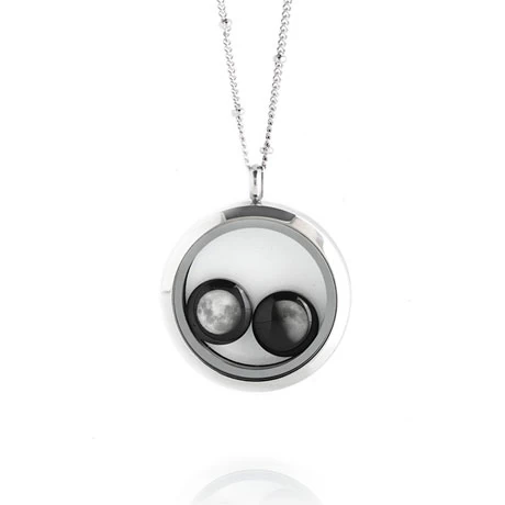 Together forever in your heart and in this unique locket. Two mini Moonglow charms, tucked securely in a locket, show your devotion to a partner, a parent, a child, whomever you want to remember. The charms show the moon as it looked on the nights of your choice. Let us know the two dates to use for your charms and we will determine the moon phases for you. Charms absorb light during the day and glow in dark environments. Locket comes on 24″ chain. 1″ diameter. Allow 3 weeks. No rush delivery or gift box.