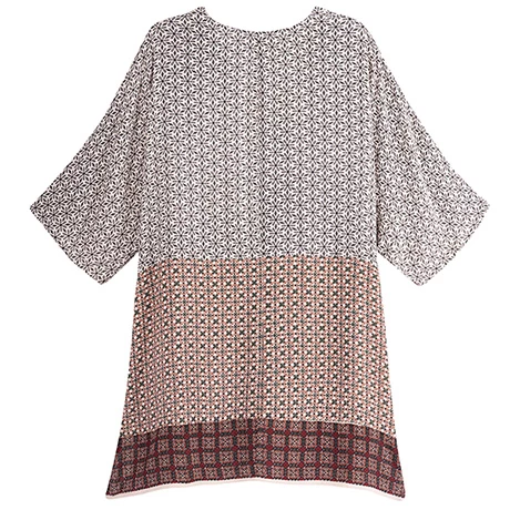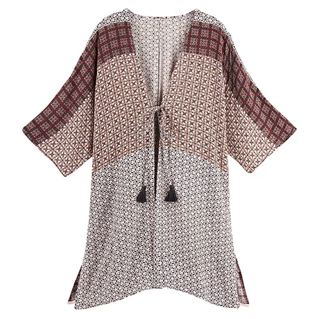 A celebration of contrasts! Multiple hues combine to create delightful geometric prints reminiscent of the designs found in Moroccan tiles. Pieced together, they create a striking unstructured jacket with ¾-length sleeves and a simple tassel tie on the front. Pair with a skirt, leggings, or jeans. 7″ side vents. 100% rayon. Sizes S/M (6-10), L/XL(10-14), XXL(16-18). S/M hangs 32″. Hand wash. Imported.