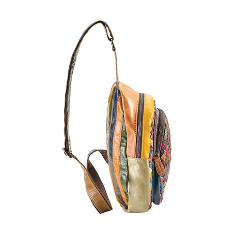 Perfection exists in colorful top-grain leather. This stylish sling bag has hands-free convenience with two zip-close compartments and two zip pockets to hold your essentials. Both the strap and interior are lined for your comfort. Woven leather front with patched leather sides and back. Strap adjusts from 30”-50”L. Expect slight variations in colors. Imported. 10.5”H x 7”W x 3”D.