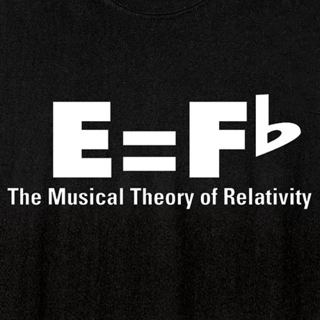 Exclusive! In music theory, E also equals F-flat. Or D-doublesharp. As Einstein (who loved music) might have said, “It’s all relative.” Black sweatshirt is 50/50 cotton blend; T-shirt is 100% cotton. Sizes M-XXL. Imported.