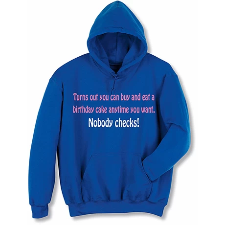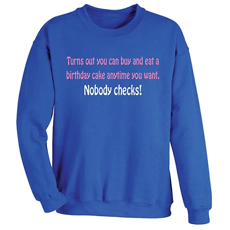 You can even put a candle on it—imagine all the extra wishes! Royal blue sweatshirts are 50/50 cotton/poly. T-shirt is preshrunk 100% cotton. Machine wash. Imported. S-3XL.