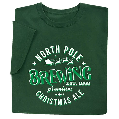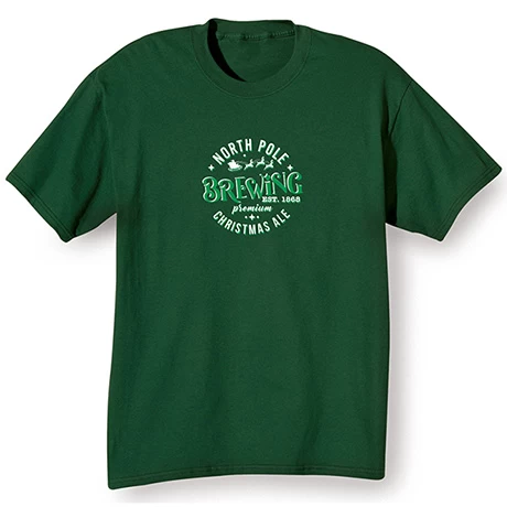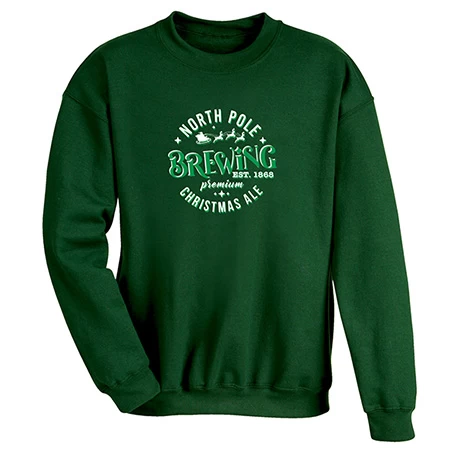 The cartoonist Thomas Nast placed Santa at the North Pole in 1863. With all the hard work going on, it was only logical that a brewery soon followed. Dark green sweatshirt is 50/50 cotton blend, T-shirt is preshrunk 100% cotton. Machine wash. Imported. S-3XL.