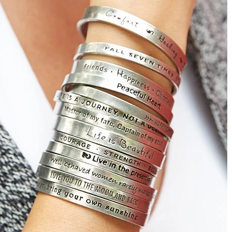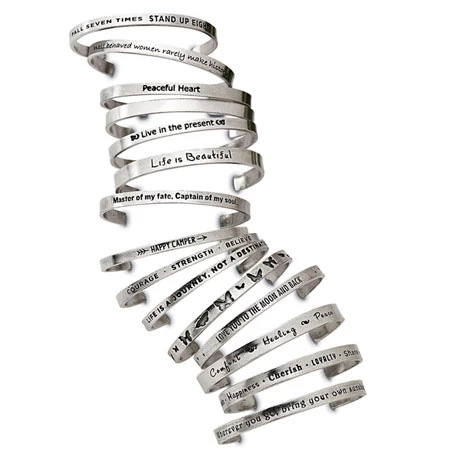 | Select Style | Butterfly, Comfort Healing, Courage Strength, Friends/Happiness, Fall Seven Times, Happy Camper, Life Is Beautiful, Life Is A Journey, Live In The Present, Master Of My Fate, Peaceful Heart, Peace Comes Within, To The Moon And Back, Well-Behaved Women, Wherever You Go, Be Kind, Choose Joy, Courageous Heart, Do What You Love, Dance It Out, Follow Your Bliss, Little But Fierce, Love You More, Never Give Up, Protect This Woman, She Believed, Sassy Pants, Strong New Skinny, Be the Change, Be Magical, Be YOU tiful, Coexist, Empowered Women, Girl Power, I Can and I Will, Kind Heart, Fierce Mind & Spirit, Loved, She Needed a Hero, Nevertheless She Persisted, The Question isn't Who, Serenity Prayer, We Rise, I Alone Cannot Change the World |