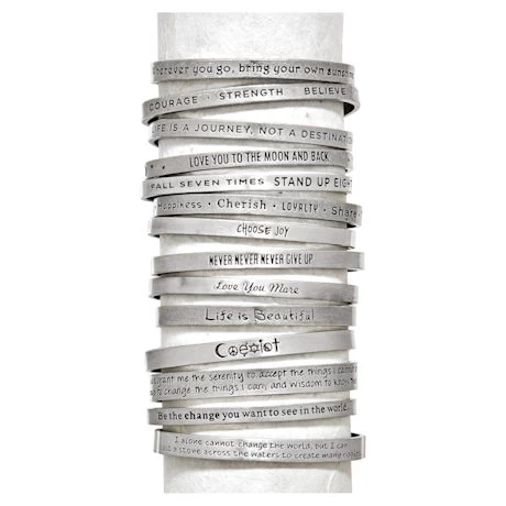 What kind of life do you want to live? Think of these bracelets as notes to yourself, strings around your finger, or wearable reminders of what matters most to you. Wear one or several for the latest look (and a lot of inspiration). Create special sets for the women on your list. From jewelry artists Howard and Whitney Schwartz, handcrafted in recycled lead-free pewter, ¼” cuffs are made in the USA. Choose message.