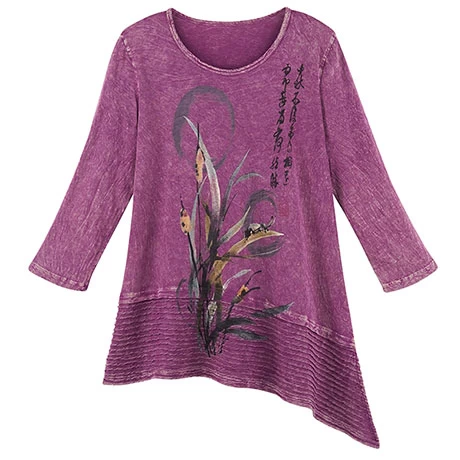 Cattails and a grasshopper captured in a soft, watercolor-like print. A striking asymmetrical contrasting hem stitched with horizontal pintucks. A color with the richness of a plum sorbet. A top this pretty is just the boost your wardrobe needs. ¾-length sleeves, 8″ side vent. Pure cotton knit. Sizes S(6-8), M(10-12), L(12-14), XL(14-16), 1X(18-20), 2X(20-22), 3X(22-24). Size M hangs 28″ at shortest point. Machine wash. Made in USA.