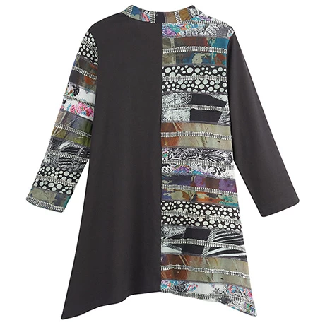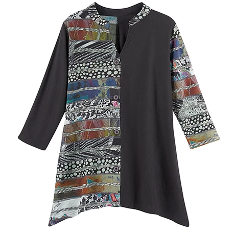 The popular design technique of color blocking gets a boho boost when patchwork prints areĀ used in place of a solid color to contrast with the black. But the fun doesn’t stop there. The top’s embellishments add even more contrastĀ to the engaging look, including ruffly trim on the patchwork seams and decorative black-and-white buttons. Side seam pockets. Cotton/rayon/spandex. Machine wash. Imported.Ā S(6-8), M(10-12), L(14-16), XL(16-18), 1X(18-20), 2X(20-22), 3X(22-24).Ā M hangs 30″, longer on sides.