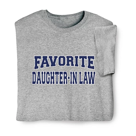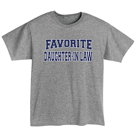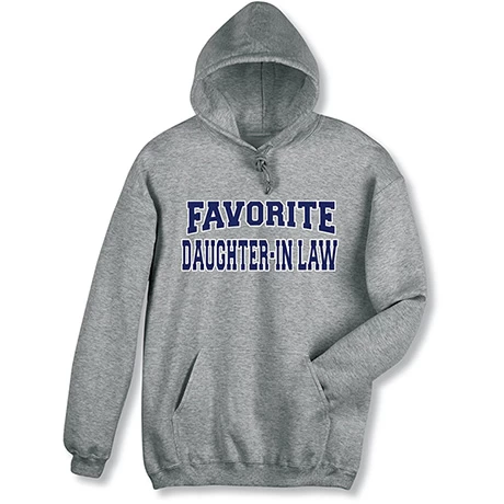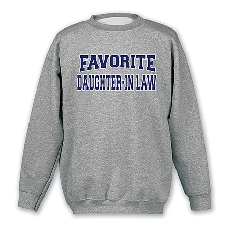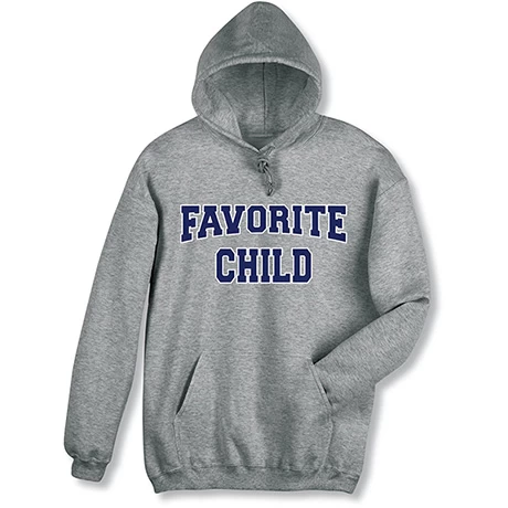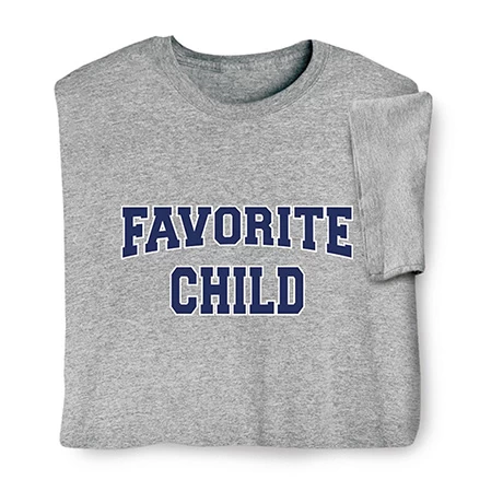 You might want to buy these shirts for all of your kids. Sport Gray sweatshirt is 50/50 cotton/poly. T-shirt is preshrunk 90/10 cotton/poly. Machine wash. Imported. S-3X. Personalize with Child, Son, Daughter, In-Law or whoever the “favorite” is, up to 18 characters.