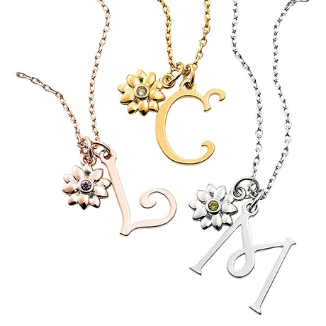 A cheerful pendant to celebrate a special occasion, a birthday, a big accomplishment, or simply to say “I love you.” The pendant features two charms: one an initial in beautiful script, the other a sweet flower with a crystal birthstone accent. The stone can reflect the recipient’s birth month, an anniversary month, or a favorite color. Letter size varies (roughly ⅝” – ¾”). Sterling link chain (16″ + 2″ extender) with lobster claw clasp. Specify an initial and a birthstone month/color. Choose Sterling Silver Plated Brass, 14K Gold Plated Plated Brass, or 14K Rose Gold Plated Brass. Allow 3-4 weeks for delivery. No rush delivery.