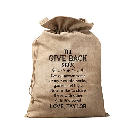 Most communities have places to donate children’s books and gently used games and toys. Build empathy and launch a lifetime of giving and sharing with the Give Back Sack. Roomy polyester sack has a drawstring top. 22″ wide, 35″ high. Specify your child’s name or another message (up to 16 letters including spaces). The word “love” is not included automatically, so please include in the personalization entered if desired. No rush delivery or gift box.