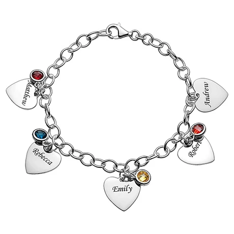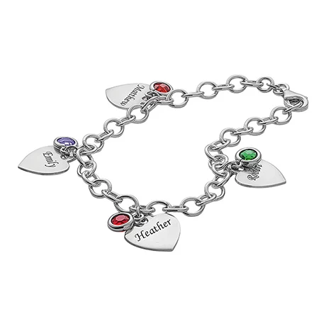 Sparkling crystal birthstones pairĀ withĀ an engraved heart to create a delightfullyĀ charming way to celebrateĀ theĀ loved ones in your life. Each heart charm can be personalized withĀ 1 nameĀ and a corresponding birthstone. 7½”Ā silver plated brassĀ link bracelet features aĀ lobster claw clasp. Specify the number of heart charms (2-5), the name on each charm (up to 8 characters each), and the birth monthĀ for each charm.Ā Allow 3-4 weeks for delivery. No rush delivery.