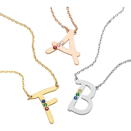 Surprise a mother, grandmother, daughter, or best friend with a lovely necklace that’s uniquely personal. The pendant features an initial in beautiful script accented with 3 crystal stones. Each stone can reflect the recipient’s children’s or grandchildren’s birth months or favorite colors. Or simply combine colors to create a striking mix of hues. Pendant size varies by letter (roughly ⅝” – ¾”). Sterling link chain (16″ + 2″ extender) with lobster claw clasp. Specify letter and 3 birthstone months/colors and choose Sterling Silver, 14K Gold Plated Silver, or 14K Rose Gold Plated Silver. Allow 3-4 weeks for delivery. No rush delivery.