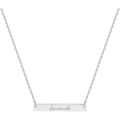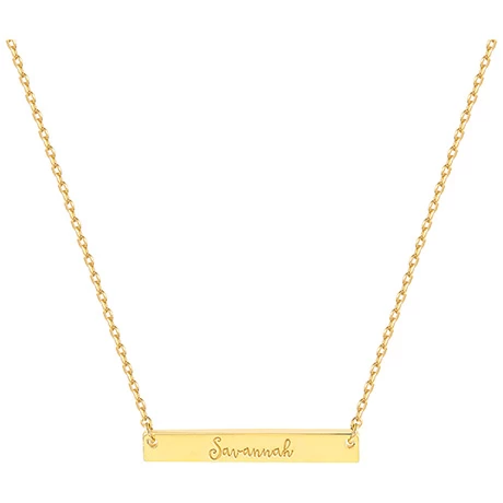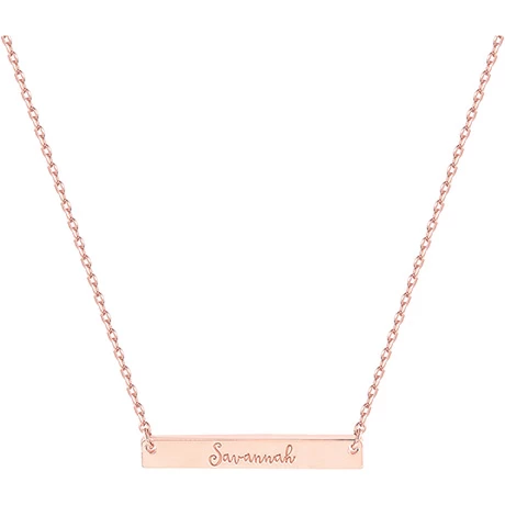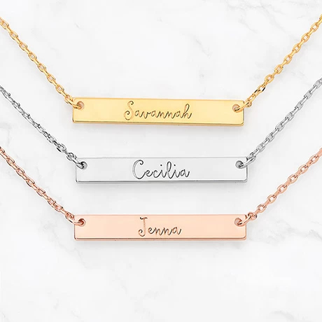 Treat yourself to a personalized necklace or surprise someone special with the perfect gift. The bar necklace is engraved with your name of choice – up to 9 letters – in an elegant script. Personalization cannot contain any special characters, emojis or shapes. Includes a chain-link necklace that adjusts from 18”-20” with a lobster claw clasp. Specify Silverplated, Goldplated or Rose Goldplated. Allow 3-4 weeks. No rush delivery or gift box.