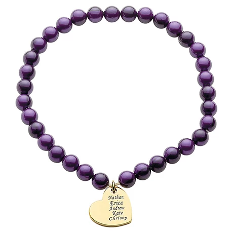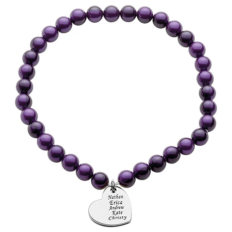 Beautiful and chic, this stretch bracelet of dyed freshwater pearls and a heart-shaped charm features a duo of customizable options that make it both beautiful and wonderfully unique. Personalize the pearls with a birthstone shade and add up to 5 engraved names to the charm. It’s perfect for Mother’s Day, a birthday, an anniversary, or any other special occasion. Stretch bracelet measures 7¼”. Choose the birthstone month for the pearl color. Choose Silver Plated Brass or Gold Plated Brass for the charm and specify up to 5 lines of text (up to 8 characters each line). No special characters, emojis, or shapes. Allow 3-4 weeks for delivery. No rush delivery.