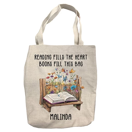 Calling all book lovers: this personalized tote will look pretty loaded with your new library finds. The poly/cotton tote says “Reading fills the heart, Books fill this bag” and can be personalized with up to 25 characters. Machine wash. Imported, printed in the U.S. Allow 2-3 weeks. No rush delivery or gift box. 15″ x 14″.