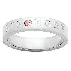 Treat yourself or surprise a loved one with a striking message of empowerment expressed simply yet elegantly. A sterling silver band.is engraved with “Stronger” and punctuated with a sparkling crystal birthstone inside the letter ‘O’. Choose the recipient’s birth month, favorite color, or other meaningful hue for the stone. About ¼” wide band. Allow 3-4 weeks for delivery. No rush delivery.