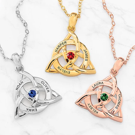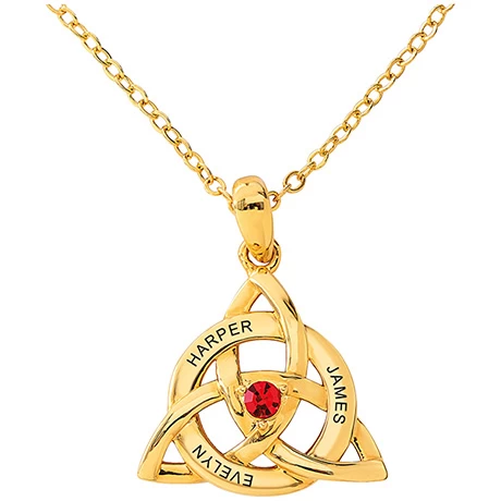 Wear the sweetest reminder of your loved ones with this trinity knot necklace. It’s a well-known Celtic symbol that represents the never-ending bond of family. The bold design incorporates your crystal birthstone in the center and the names of three people who mean the most to you. Each name can be up to 9 characters each. The lightweight cable-link chain is 16” plus a 3” extender. Lobster-claw clasp. Pendant measures 0.785” across. Specify Silverplated, 14K Goldplated or 14K Rose Goldplated. Allow 3-4 weeks. No rush delivery or gift box.