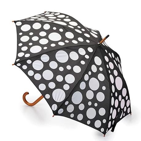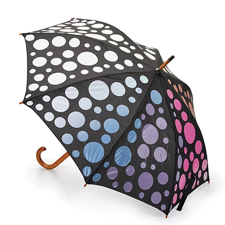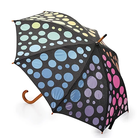 You’ll be singing in the rain when you see how cute this umbrella is. When it gets wet, the white polka dots turn into a rainbow of pastel colors. Sturdy steel frame with a wooden handle. Auto-open, manual close. 42” span.