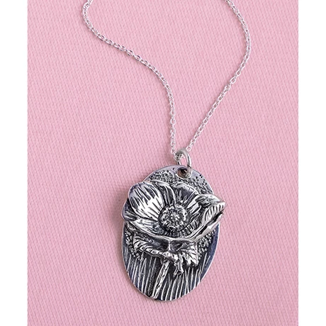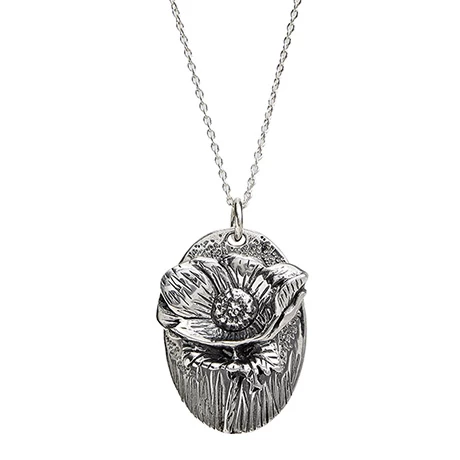 A sweet poppy flower rendered in sterling silver rests in a perfectly elegant pose on an oval base. Hanging delicately from a sterling silver chain, it’s a keepsake for a gardener or nature-lover to treasure. Pendant: Ÿ”w x 1″h. Chain adjusts 16-20″.