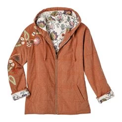 When you add up the gorgeous sleeve embroidery and rich rust color, you get a musthave fall jacket. Cuff the long sleeves to show off the patterned lining. Lightly quilted with a drawstring hood, front pockets and front zip. Cotton with viscose lining. Dry clean. Imported. S(6-8), M(10-12), L(12-14), XL(14-16), 1X(18-20), 2X(20-22), 3X(22-24). Size M hangs 27″.
