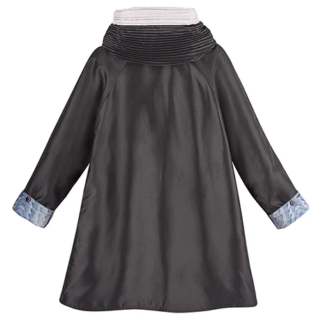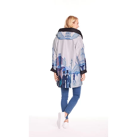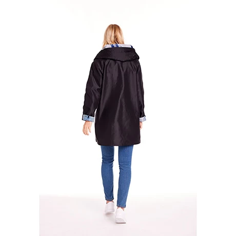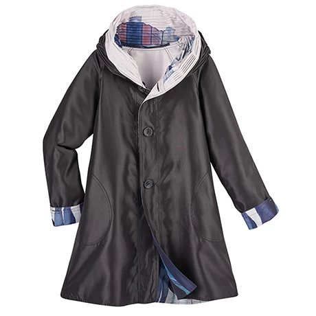 - Reverses to black so it’s two raincoats in one: a printed raincoat and an elegant black raincoat