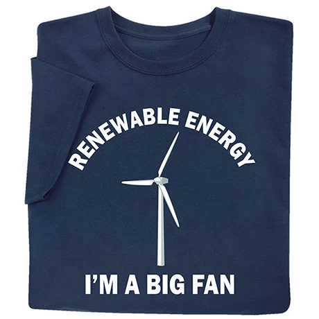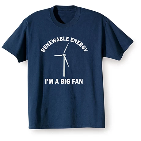 That’s right. You’re a big fan, as in GIANT fan, because it’s cool to be on the side of clean energy. NavyĀ sweatshirts are 50/50 cotton blend, T-shirt is preshrunk 100% cotton. Machine wash. Imported. S-3XL.