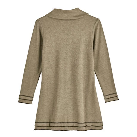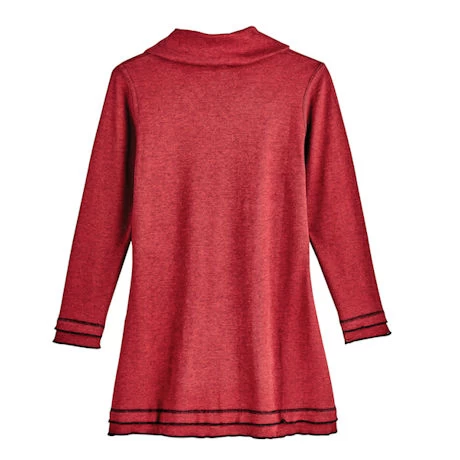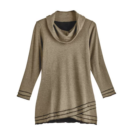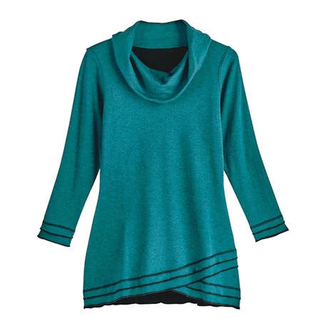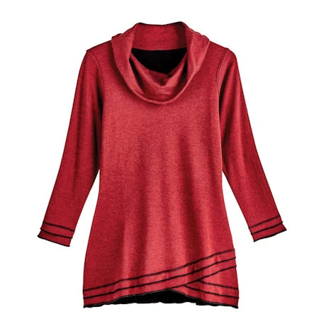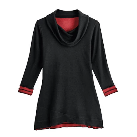 Every woman needs a basic black tunic, but we all want some color, too. All of these colors reverse to black. Tunic has a soft, wide cowl neck, full-length sleeves and subtle shaping. Black topstitching adds detail. Sizes S(6-8), M(10-12), L(14-16), XL(18), 1X(16-18), 2X(20-22), 3X(24-26). Small hangs 29″. 60% cotton, and 40% rayon. Imported. Specify Red, Teal, or Wheat.
