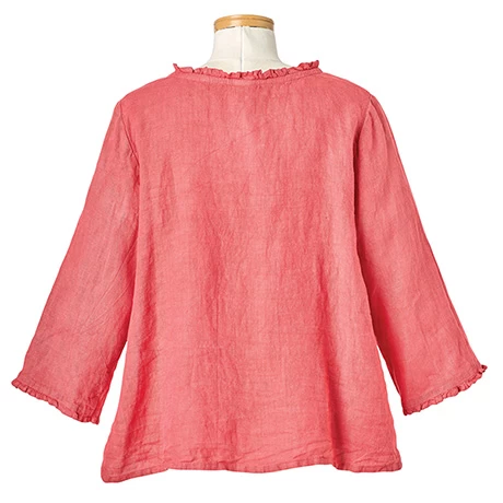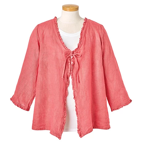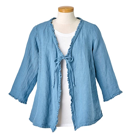 Whether thrown on to chase the chill or donned as the finishing touch of an outfit, this ruffle-edged jacket adds a casual artistry. Single self-tie at the deep V neck. 3/4-sleeves. Linen. Machine wash. USA. S(6-8), M(8-10), L(12-14), XL(16-18), 1X(18-20). M hangs 24″. Specify Poppy or Blue.