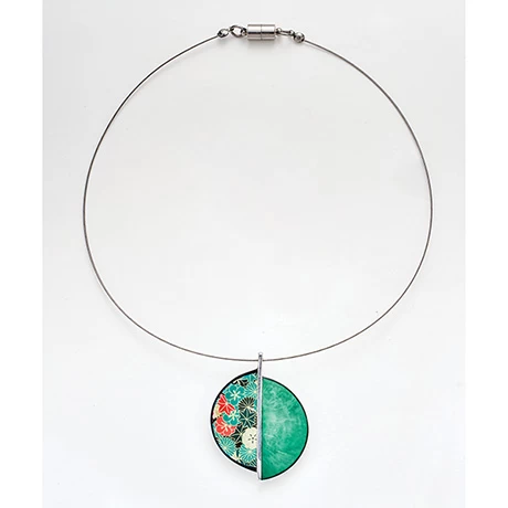 Japanese florals and jade-green resin come together to create a dramatic necklace. Itās so unique, friends will ask you where you got it. 18″ coated-wire necklace with an easy magnetic closure. Silvertone.