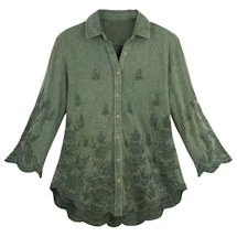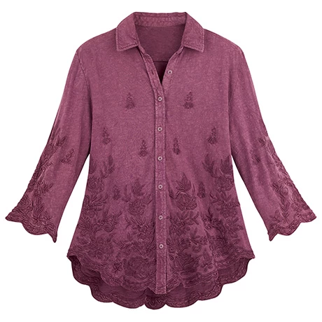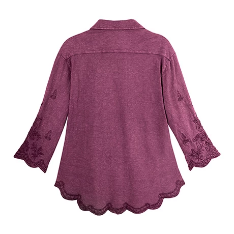 So easy to wear and love. Soft cotton jersey shirt has tonal embroidery on the full button front and ¾-length sleeves. Metal buttons, back yoke, scalloped hem and sleeve ends. Hi-low hemline. Sizes S(4-6), M(8-10), L(12-14), XL(14-16), 1X(18-20), 2X(20-22), 3X(22-24). M hangs 26″ front, 28″ back. Machine wash. Imported.
