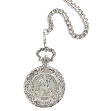 The Silver Seated Liberty Half Dollar enhances the beauty of this intricately carved pocket watch case. The Silver Seated Liberty Half Dollar was minted 1839 to 1891. The design of Lady Liberty sitting on a rock, known for the depiction of freedom adds a touch of American Pride to this handsome timepiece. This watch has a sweep second hand, quartz precision, and a one year warranty. Attached to a fob chain it arrives with a Certificate of Authenticity. Allow 1-2 weeks for delivery.