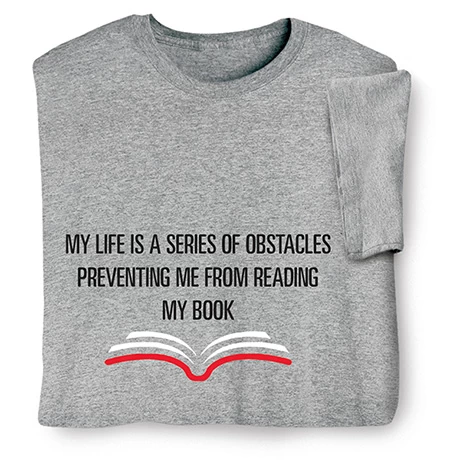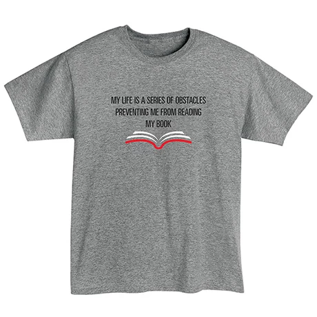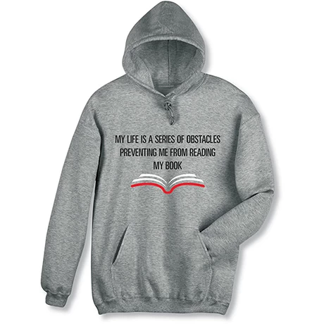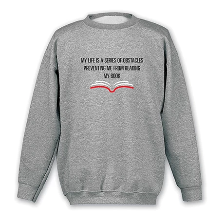 It feels like this sometimes, doesn’t it? It seems especially true when you get to the most suspenseful part of the book and you don’t want to put it down. Sport Gray sweatshirt is 50/50 cotton blend, T-shirt is preshrunk 90/10 cotton/poly blend. Sizes S-3XL. Imported.