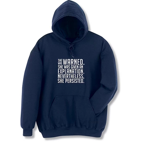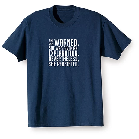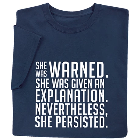 First spoken on the floor of the US Senate in 2017, these words birthed a rallying cry—”Nevertheless she persisted”—encouraging women to pursue their rights and break barriers. Navy sweatshirts are 50/50 cotton blend, T-shirt is preshrunk 100% cotton. Machine wash. Imported. S-3XL.