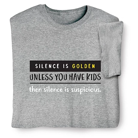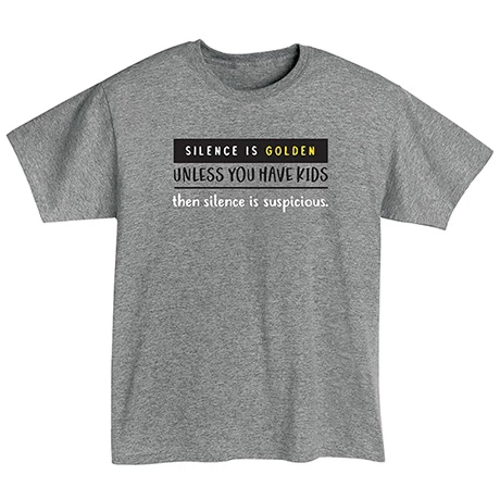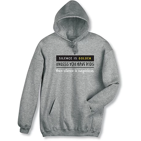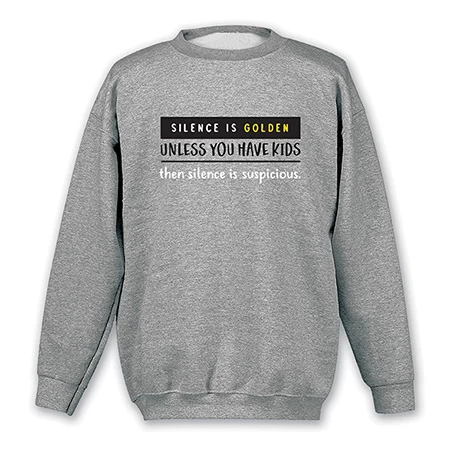 An age-old proverb bites the dust when aX. Exclusive Silence is Suspicious Shirts An age-old proverb bites the dust when applied to kids: The moment you hear nothing is the moment you start to worry. Sport gray sweatshirt is 50/50 cotton blend, T-shirt is preshrunk 90/10 cotton-poly. Sizes S-3XL. Imported.