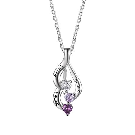Thereās nothing like family love, so show it off! This gorgeous sterling silver necklace features three CZ heart birthstones alongside and engraved name for each stone. Suspended from an 18ā sterling silver chain, this stunning necklace makes a thoughtful gift. Specify each name, up to 8 characters each. No special characters, emojis or shapes. Only the first letter of each name will be capitalized. Pendant measures 1.3āL. Allow 3-4 weeks. No rush delivery or gift box.