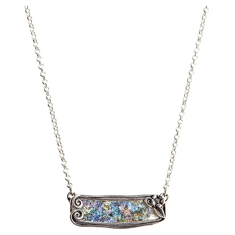 An ancient shard of Roman glass is sweetly embraced in a sterling silver frame that has an appealingĀ organicĀ vibe. The setting isĀ embellished with scrollworkĀ and a tiny flower. The glass, more than 2,000 years old andĀ treasured for its age and patina, was excavated from an archeological site in Israel. Pendant: ¼”hĀ x 1???”w. 16″ sterling silver chain with lobster claw clasp. Made in Israel.