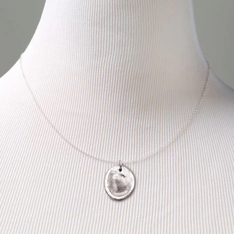 Capture a moment with a custom fingerprint pendant suspended on a sterling silver 18″ necklace. While a photograph might bend or lose clarity as time takes its toll, your custom fingerprint pendant in sterling silver can maintain a unique impression for years to come. Crafted individually in Knoxville, Tennessee, it requires only a single impression to immortalize a friend, pet, or loved one. Personalize with up to 3 initials on the back. Upon receipt of kit, you will create an impression following the detailed instructions and drop it in the mail. In 2-4 weeks, you will receive your custom fingerprint necklace.