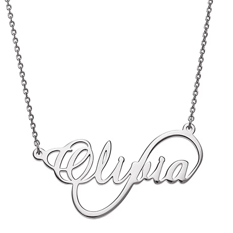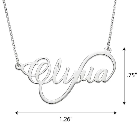This charming necklace is a beautifully personal choice that would make an excellent gift! Crafted in polished sterling silver, a name of your choice (up to ten characters) is spelled out in lovely script type that is decorated with the subtle swoop of an infinity symbol for a meaningful touch. First letter capitalized only. Hangs on a 16ā- 18ā adjustable sterling chain with lobster clasp.