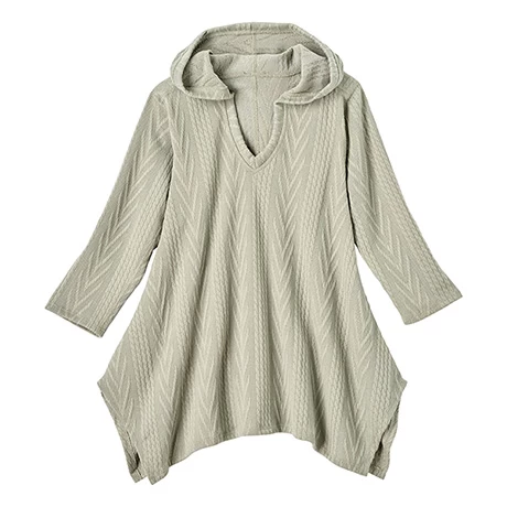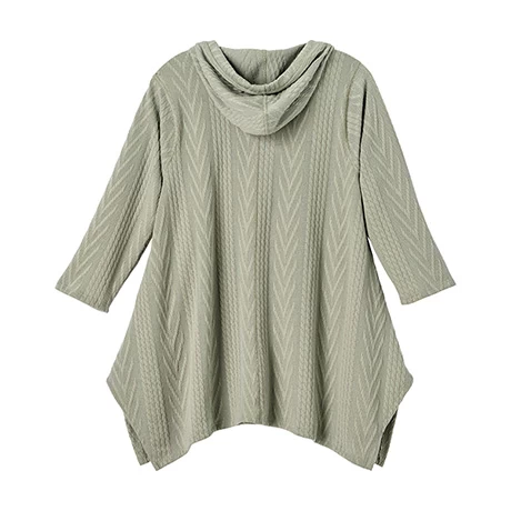 Beautiful textures meet up in this soft sage-green top. It has a slouchy hood and forgiving fit with throw-on-and-go ease. V-neck, 3/4-sleeves, 9” side vents. Poly/spandex knit. Machine wash. Imported. S(6-8), M(10-12), L(12-14), XL(14-16), 1X(16-18), 2X(18-20). M hangs 26″, back 29″.