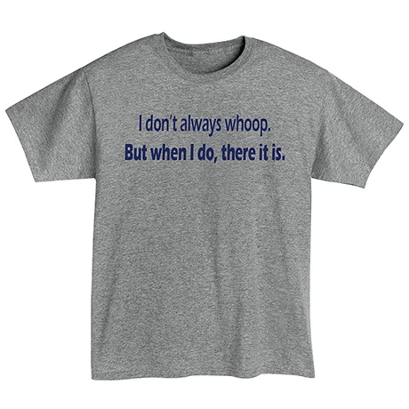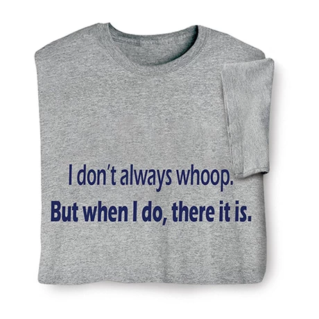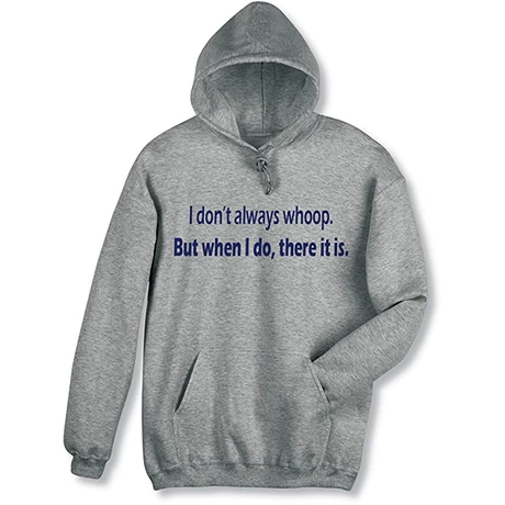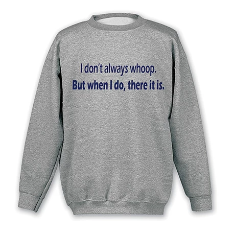And yes, it’s a big whoop. Sport gray sweatshirts are 50/50 cotton/poly. T-shirt is preshrunk 100% cotton. Machine wash. Imported. S-3XL.