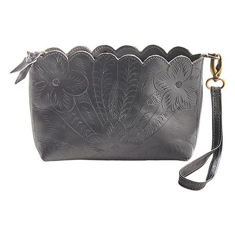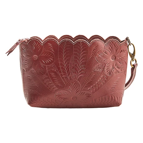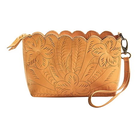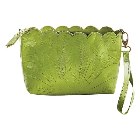 When you just want to carry the essentials, make it a wristlet. This beauty is hand-tooled and finished with a scalloped edge. Zip top, antiqued brass hardware, nylon-lined interior with divider. The 6″ leather wrist strap is removable for when you want to carry this as a clutch or tuck it inside a larger bag. 7 ½”w x 5″h x 2″d. Imported. Specify Black, Green, Orange, Purple, Yellow, Pink, Turquoise, or Red.