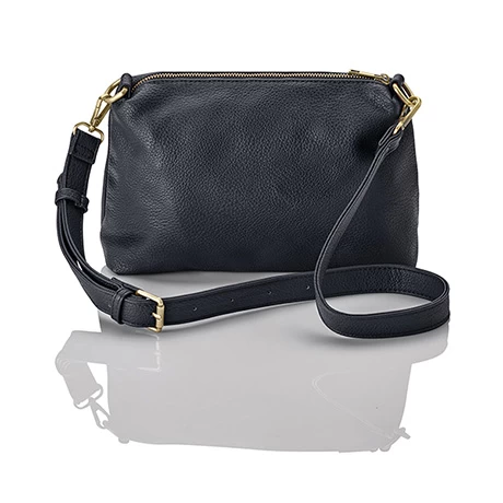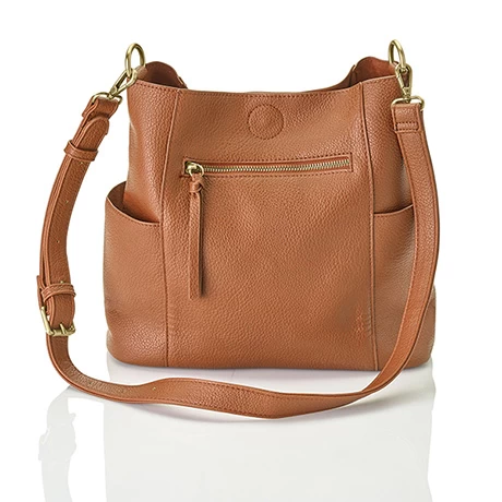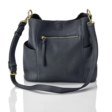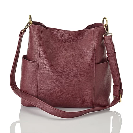 A perfectly sized crossover bag—not too big, not too small—that’s practical, pretty and has a hidden secret. What you can see: the soft pebble grain vegan leather construction, 3 outside pockets, and a leather strap. What you can’t see: a removable inside bag. Keep it in place for extra security or use it when you’re in the mood for a smaller purse. Magnetic snap closure. Strap adjusts 35″-42″. 11″W x 11.25″H x 3.5″D. Imported. Specify Black. Bourbon, Oxblood (featured), Peacock, Red, Olive, or Navy.
