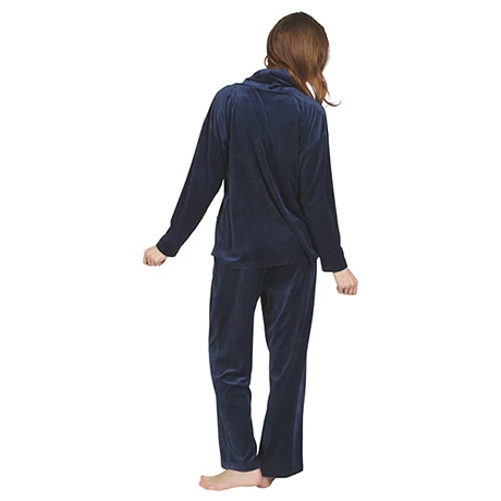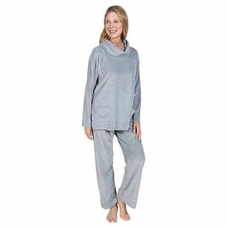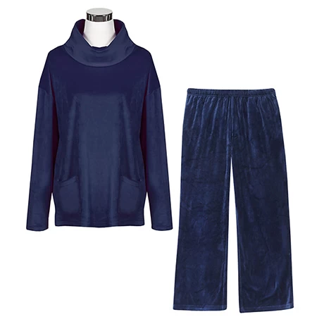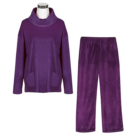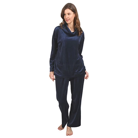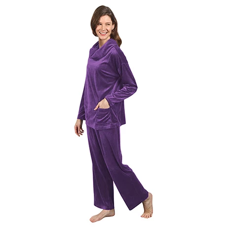 Pretty to wear, cozy to lounge in. Velour set features a soft drapey cowl-neck top with long sleeves and 2 patch pockets. Lounge pants have a non-binding elastic waist. 100% polyester. Machine wash. Imported.Top Length about 28″. Pant inseam 29″. Missy: M(10-12), L(14-16), XL(18-20) Women’s: 1X(16W-18W), 2X(20W-22W), 3X(24W-26W).